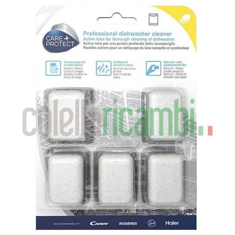Questa confezione di Tabs Igienizzanti per Lavastoviglie Care+Protect contiene 5 Tabs attive da 20gr. La formula professionale con enzimi attivi le rende ideali per una pulizia profonda del filtro e dei componenti interni della lavastoviglie (tubi, vasca, bracci...), sgrassando, igienizzando ed eliminando residui di lavaggio e restituendo una fresca fraganza di limone. La confezione comprende un cartoncino pre-tagliato, che facilita l’espulsione delle Tab.