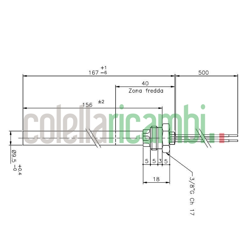 Esecuzione con raccordo filettato 3/8" GAS, diametro 9,5mm, lunghezza totale 167mm, lunghezza sottobattuta 156mm, 250Watt.