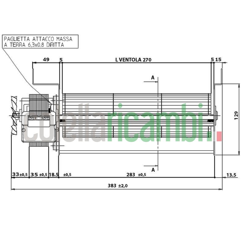 Inoltre le dimensioni, lunghezza totale 383mm, dimensioni bocchetta uscita aria: 283x44mm, consentono al ventilatore tangenziale una più facile adattabilità a diverse applicazioni.