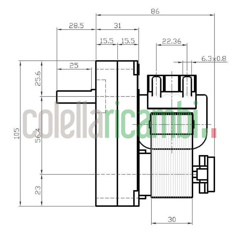 Serie 917, coppia nominale 8 Nm, assorbimento 25 Watt, velocità 2 rpm, rotazione oraria, diametro albero 9,5 mm, pacco lamellare da 30 mm, alimentazione 220 V AC - 50/60Hz.