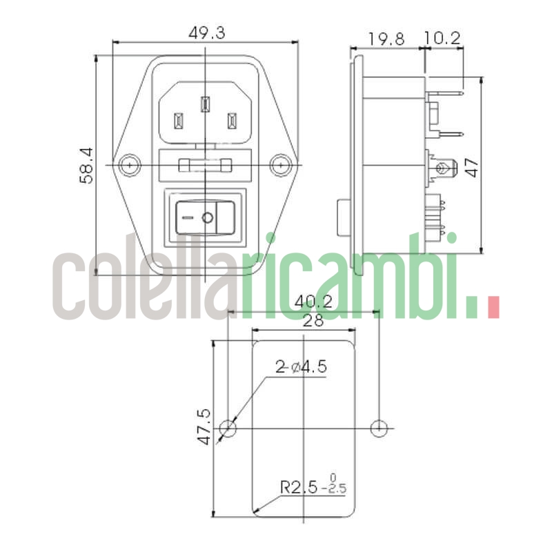Connettore da pannello con interruttore bipolare e portafusibile.