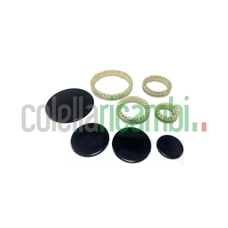 Serie  piattelli + anelli spartifiamma 4 fuochi,  Kit ADATTABILE 8 pezzi composto da 4 anelli spartifiamma  1 Grande - 2 Medi - 1 Piccolo con le relative coperture smaltate nere lucide . Per cucine e piani cottura Indesit - Ariston